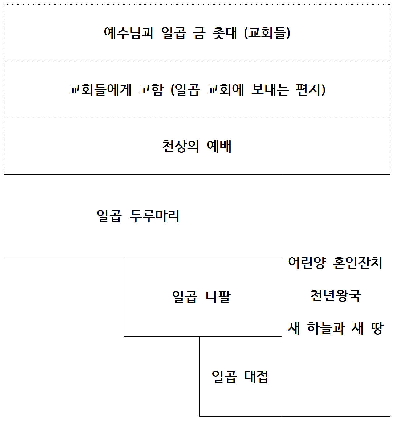 성광교회 수요사경회 (2025. 10. 15) 김강석 목사 - 요한계시록 ①묵시문학 1. 요한계시록의 주제 : “승리의 그리스도” 2. 요한이 밧모섬에서 본 환상을 기록 ① 과거설 ② 현재설 ③ 미래설 - 성도들은 어떠한 환난도 이겨내고 결국은 승리하게 된다. 3. 요한계시록의 구조 ① 교회들에게 고함(1) - 교회들의 현실(2-3) - 하늘의 예배(4) ② 비밀 두루마리를 가진 어린양(5) - 일곱 인(6-7) - 일곱 나팔(8-9) ③ 힘센 천사와 작은 책(10) - 두 증인(11) - 여자와 용(12) - 두 짐승(13) ④ 144,000(14) - 세 천사와 또 다른 천사(14-15) ⑤ 진노의 일곱 대접(16) - 큰 음녀가 받을 심판(17) - 바벨론의 멸망(18)⑥ 어린 양의 혼인 잔치, 백마 탄 자(19) - 천년 왕국(20) - 새 하늘과 새 땅(21-22)
