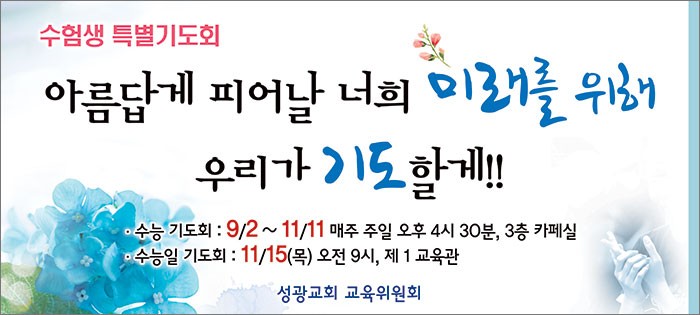 수험생을 위한 기도회 ▶ 11월 11일 주일까지, 매주일 오후예배 후 3층 카페실 * 수험생 명단 : 김하람 (김신호 집사, 민지희 권사 자녀) 최혁준 (진복원 성도 자녀) 정유진 (정건섭 집사, 이미경 권사 자녀) 김재희 (전용미 집사 자녀) 박채령 (이유경 성도 자녀) 김영준 (김미진 집사 자녀) 신지운 (김학경 집사 손자) 신규진 (이승신 집사 자녀) 임세빈 (최정기 집사 손녀) 정채린 (김인영 집사 자녀)
