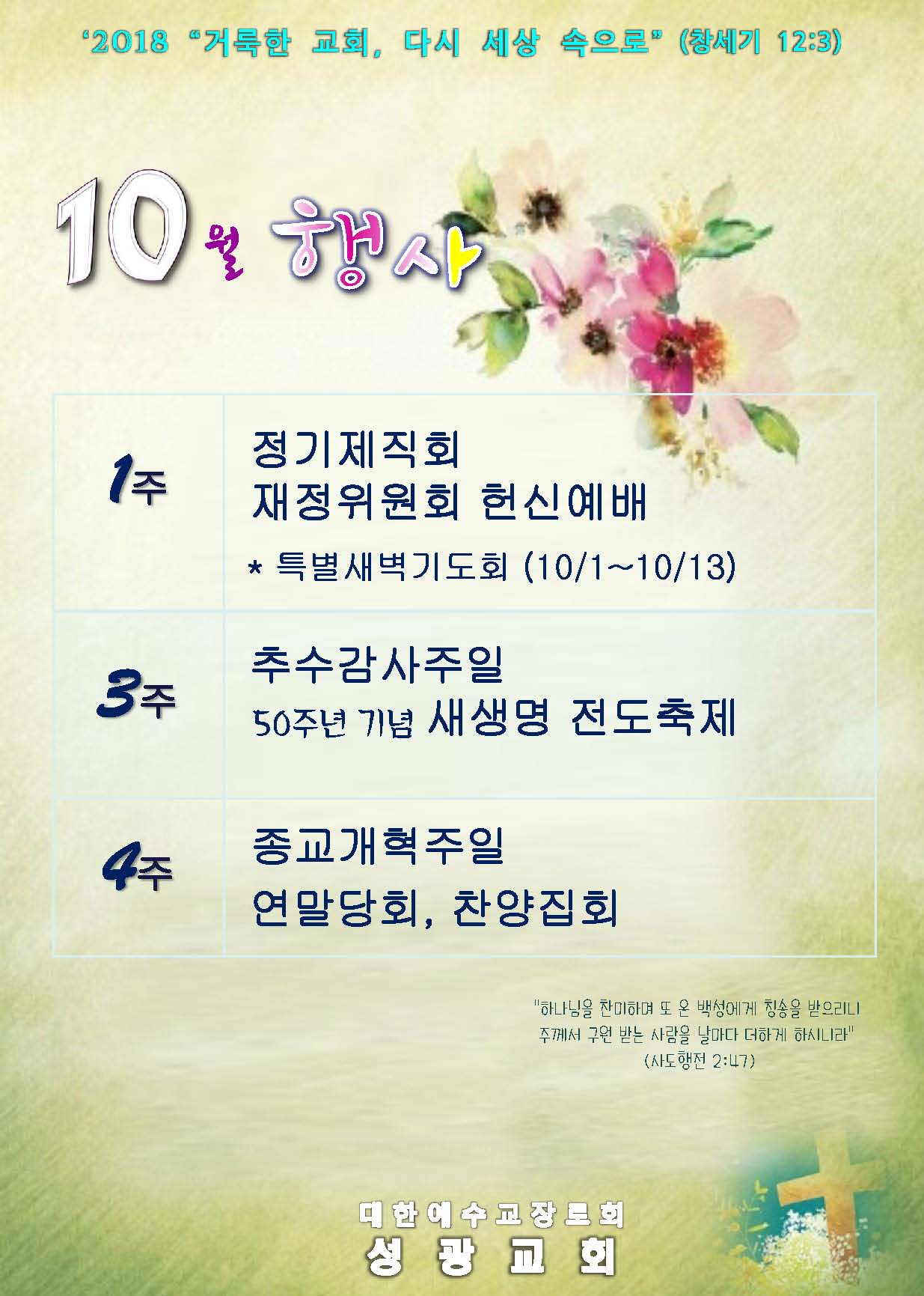 [ 10월 교회 행사 안내입니다 ] ♣ 10월 1일(월) ~ 13일(토) 특별새벽기도회기간입니다. "그리스도인의 영적인 생활"(이사야 55:3) ▶ 첫째 주일은 '정기제직회'가 있습니다. '재정위원회 헌신예배'는 다음 기회로 연기되었습니다.