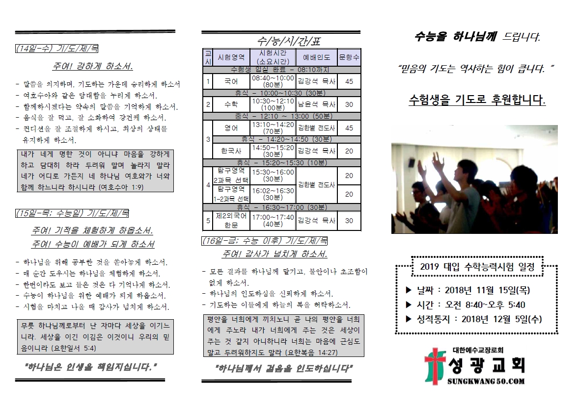 "믿음의 기도는 역사하는 힘이 큽니다"수학능력시험 당일 수험생을 기도로 후원합니다.성광의 수험생 자녀들이 지금껏 준비한 실력을 평안가운데 마음껏 발휘할 수 있길 기도합니다.주시는 기도의 제목대로 기도후원 해 주시길 소망합니다.