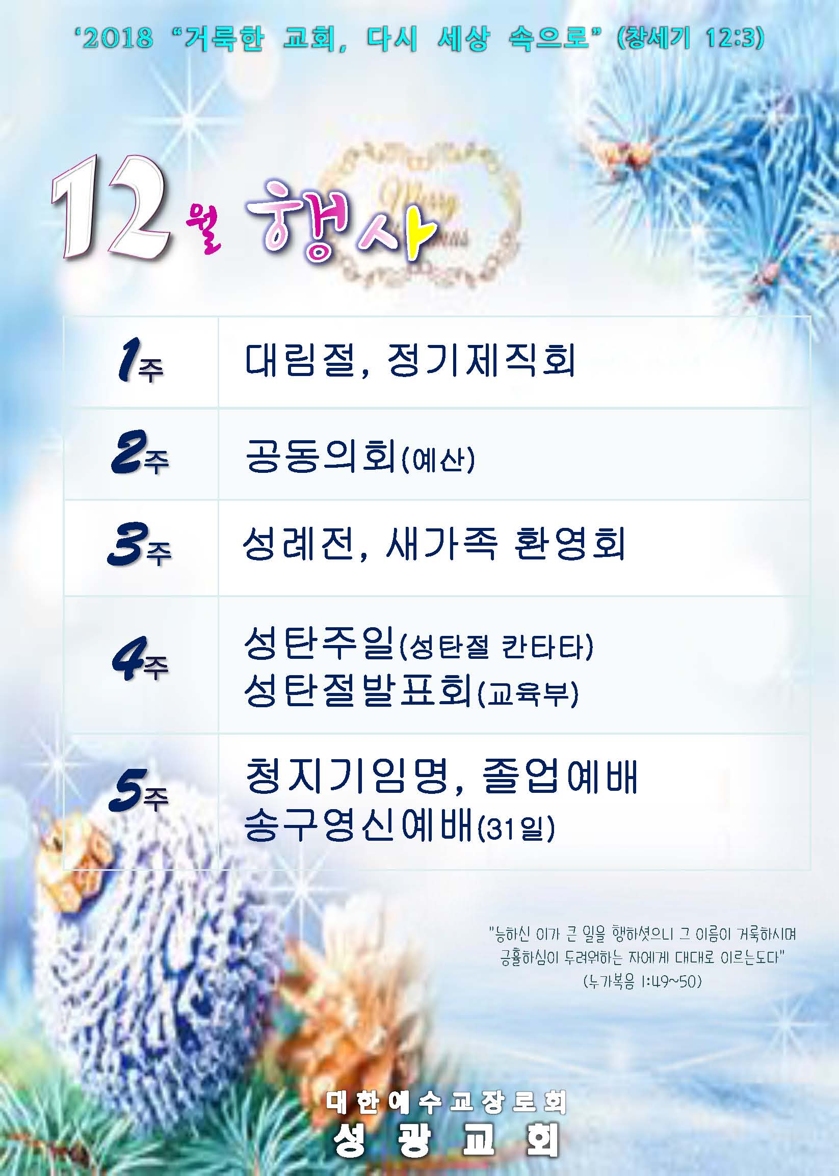 [ 12월 교회 행사 안내입니다 ] ♧ 1일(토)은 '월삭새벽기도회'입니다. 12월을 맞이하는 첫날의 새벽기도회에서 많은 은혜 받으세요. ▶ 대림절이 시작됩니다. 대림절의 의미를 깊이 묵상하는 기간되시길 바랍니다. 대림절 첫 주일엔 3부 예배 후 '정기제직회'가 있습니다. ▶ 둘째 주일(9일)은 '공동의회(2019년 예산안 통과)'가 있습니다. 오후 예배에는 러시아 바라노브스키 성광교회 유다 목사의 선교보고가 있습니다.